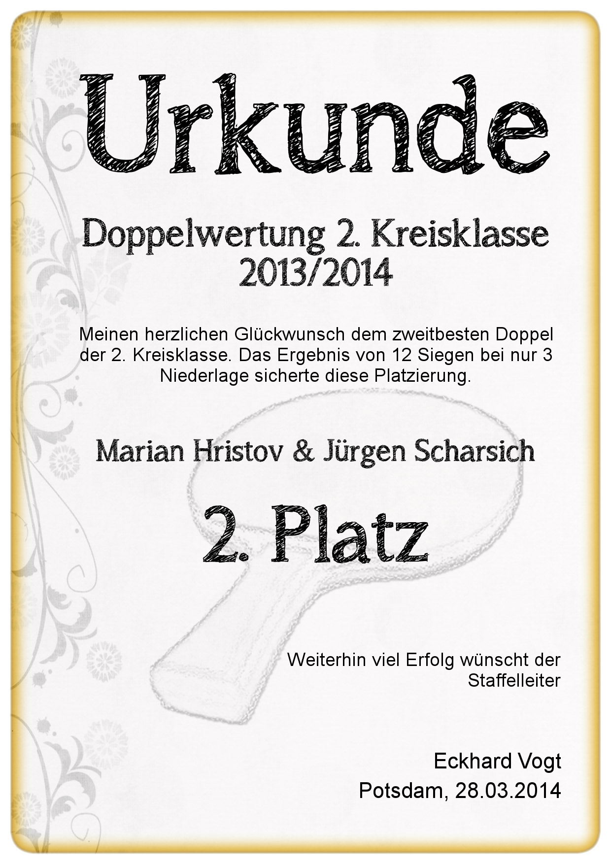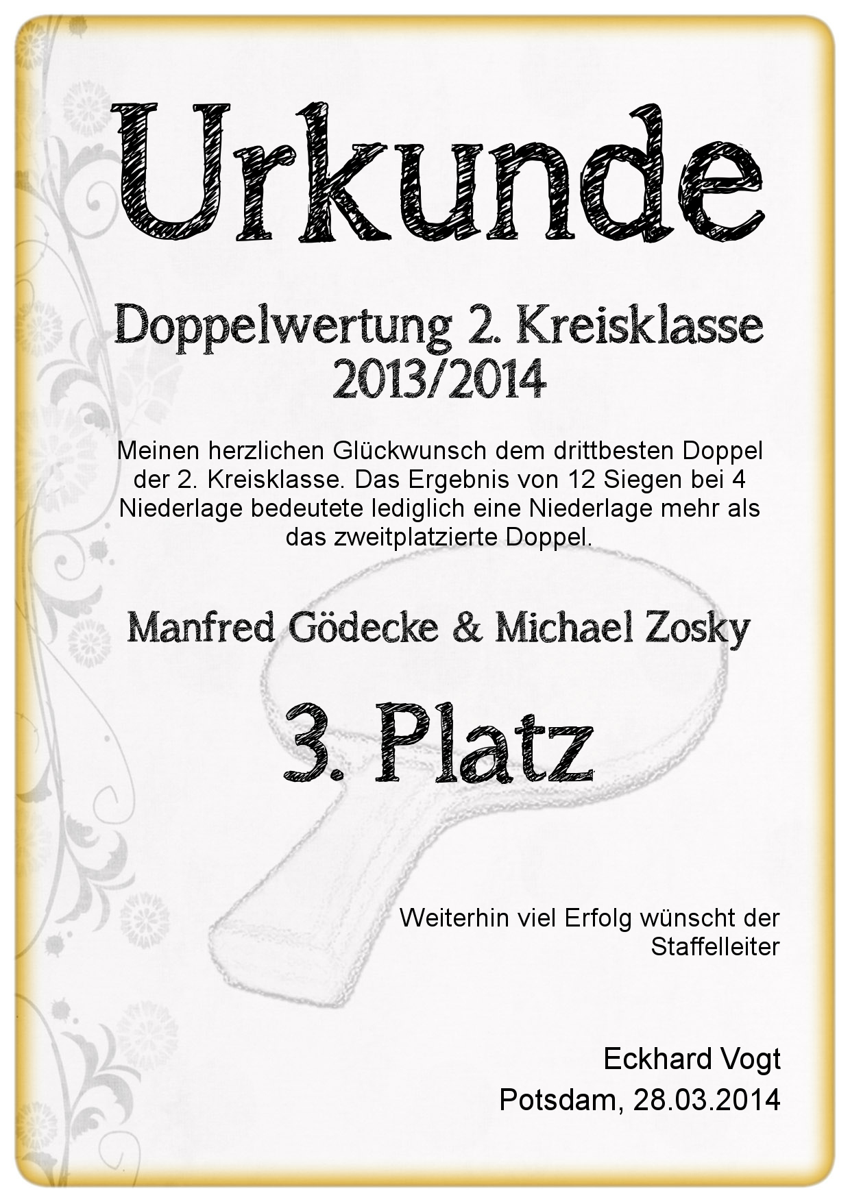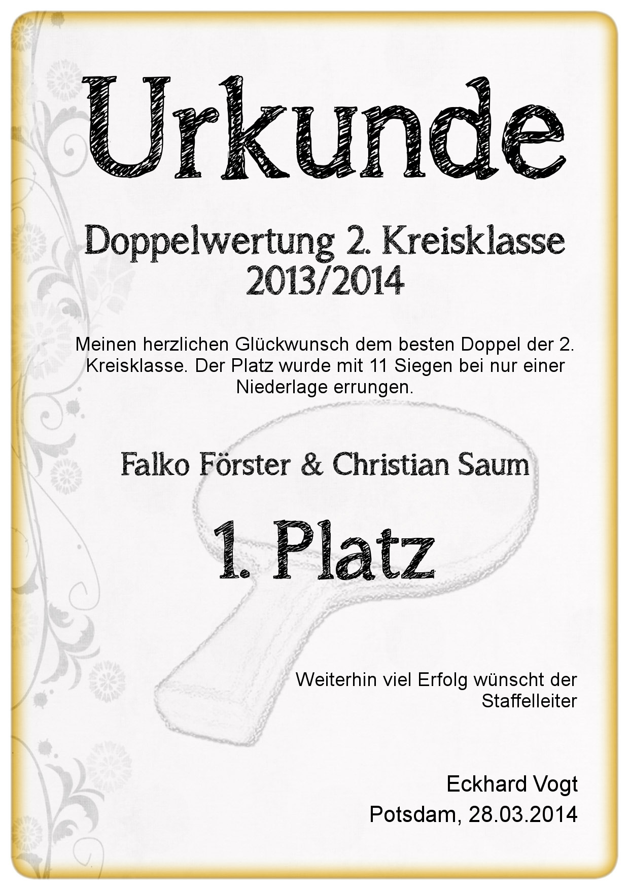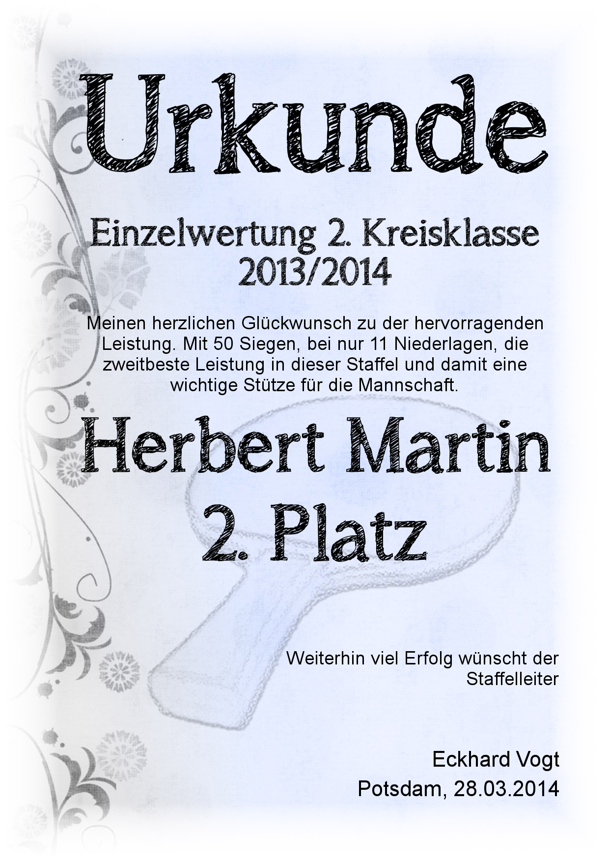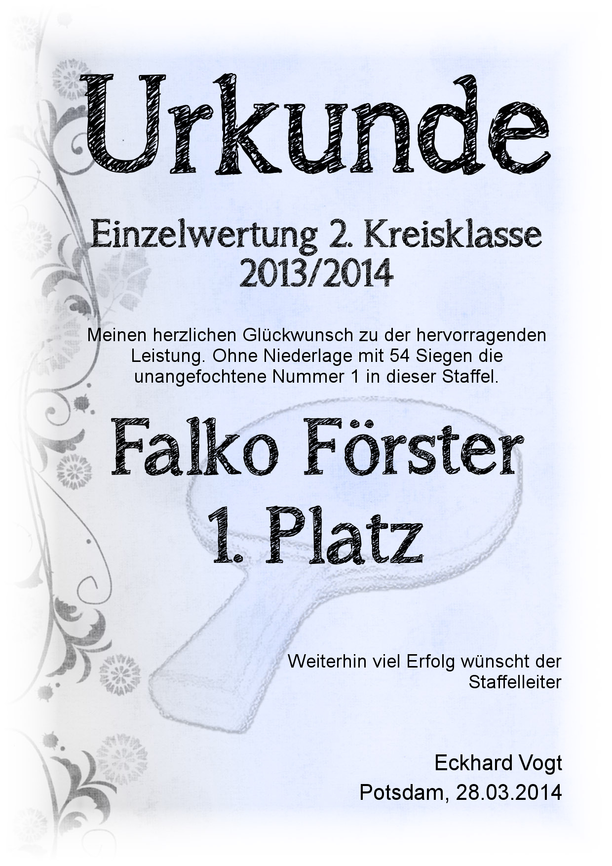 Titel „Zweitbester Einzelspieler der 2.Kreisklasse im Spieljahr 2013/2014“,